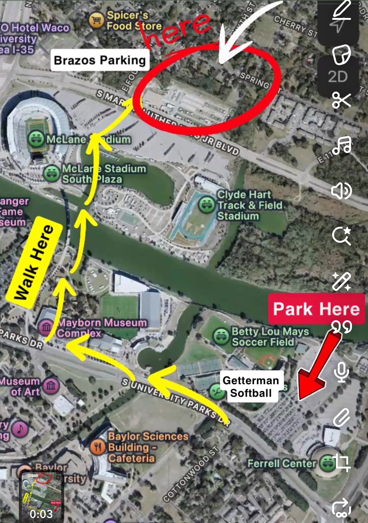 From there, walk across the bridge to McLane Stadium through Touchdown Alley and continue to the tailgate area, which will be set up for all teams.